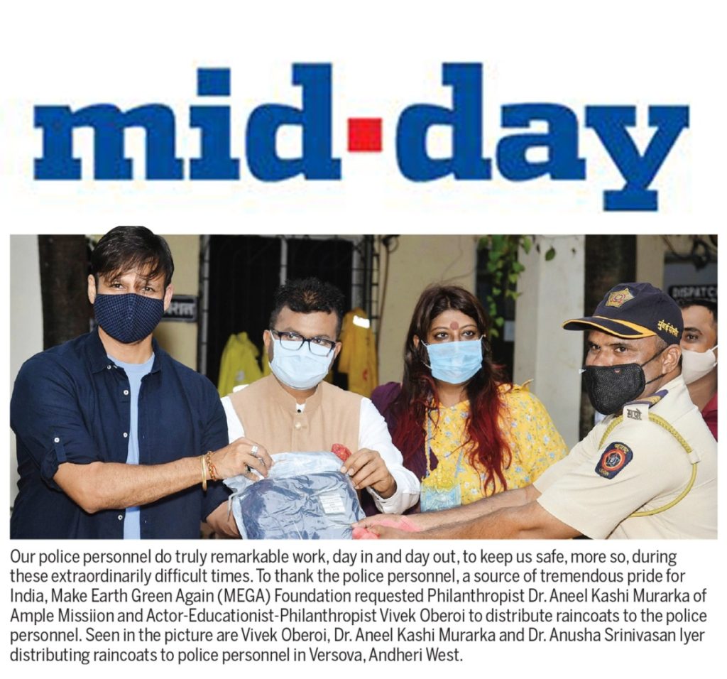 Vivek Oberoi, Aneel Murarka and Anusha Srinivasan Iyer distributing raincoats to police personnelRead Now