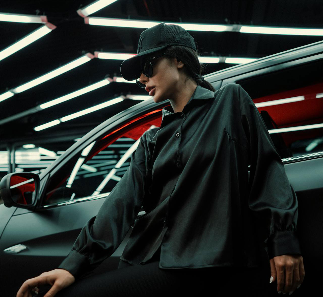 She paired her outfit with a velvet, floor-length coat.